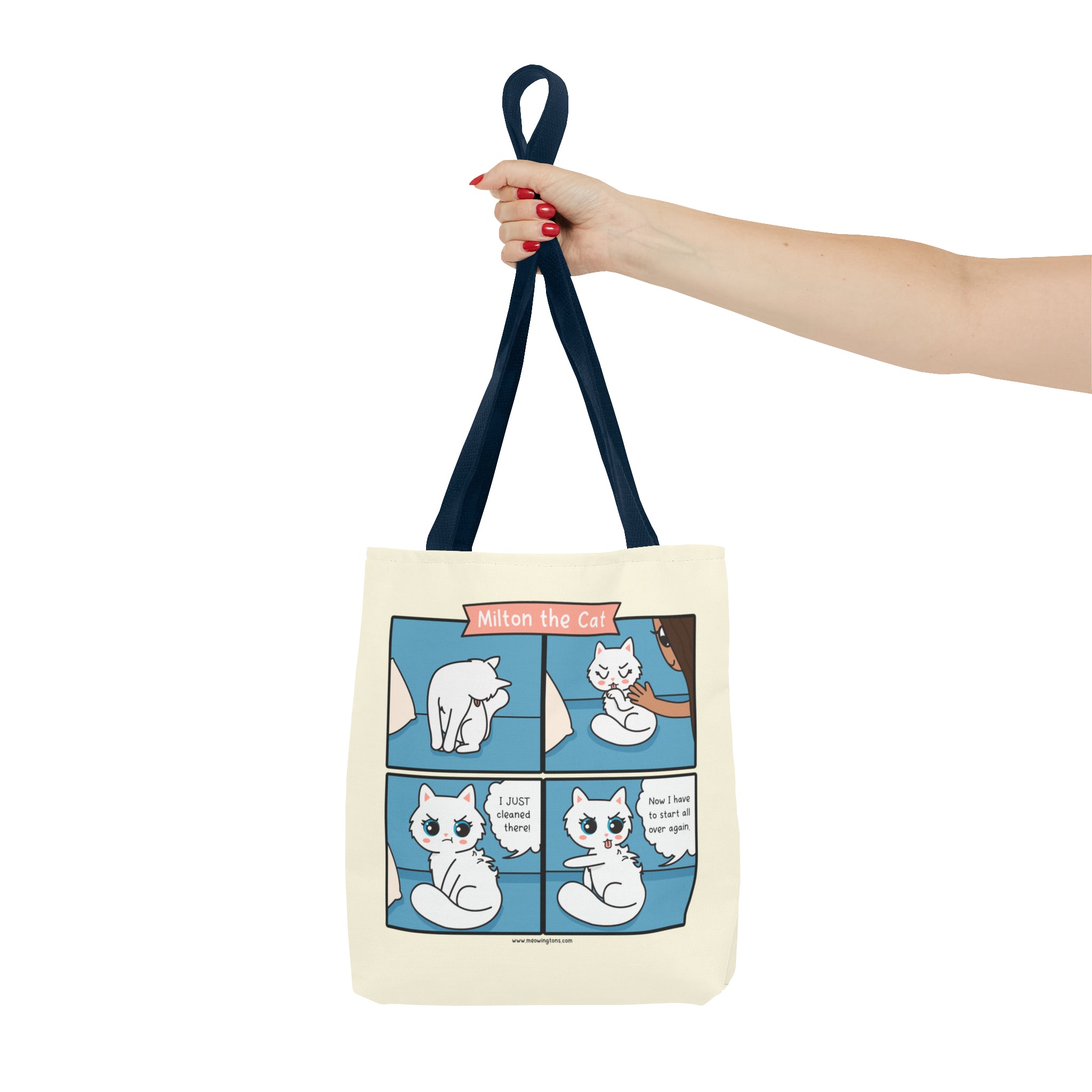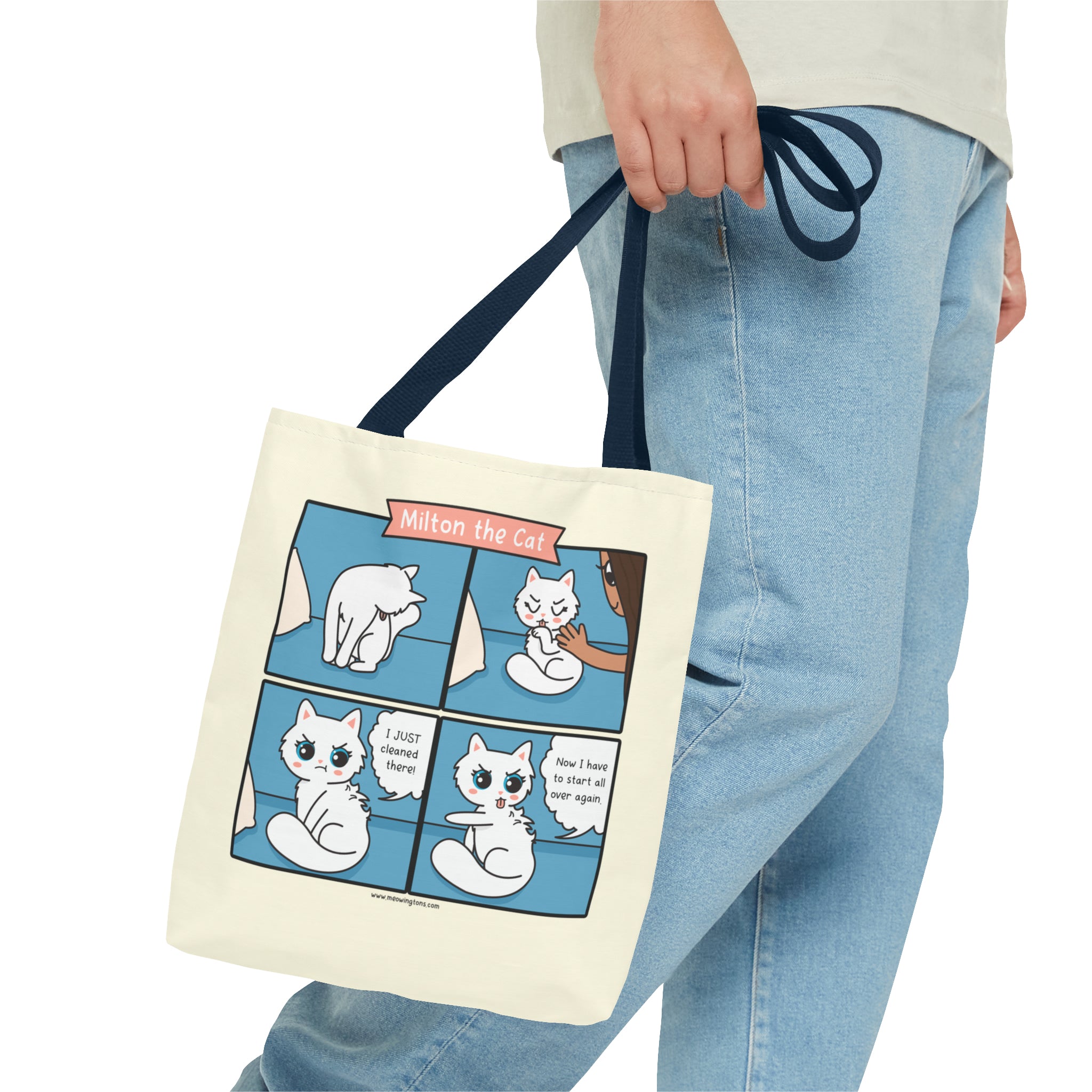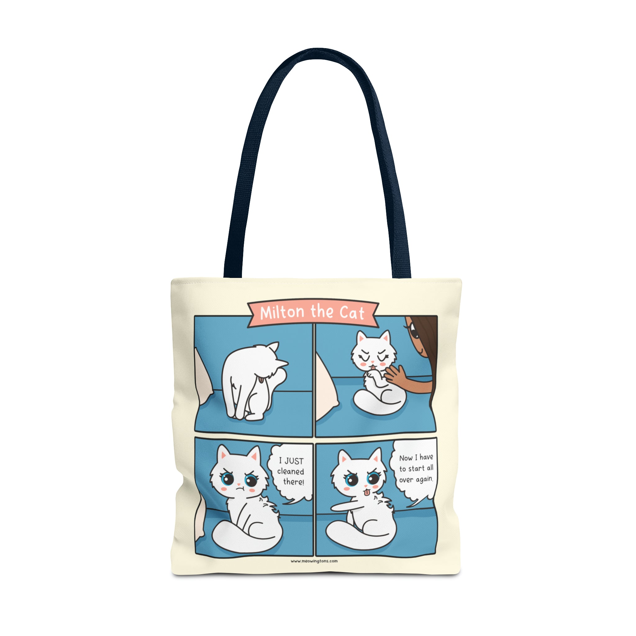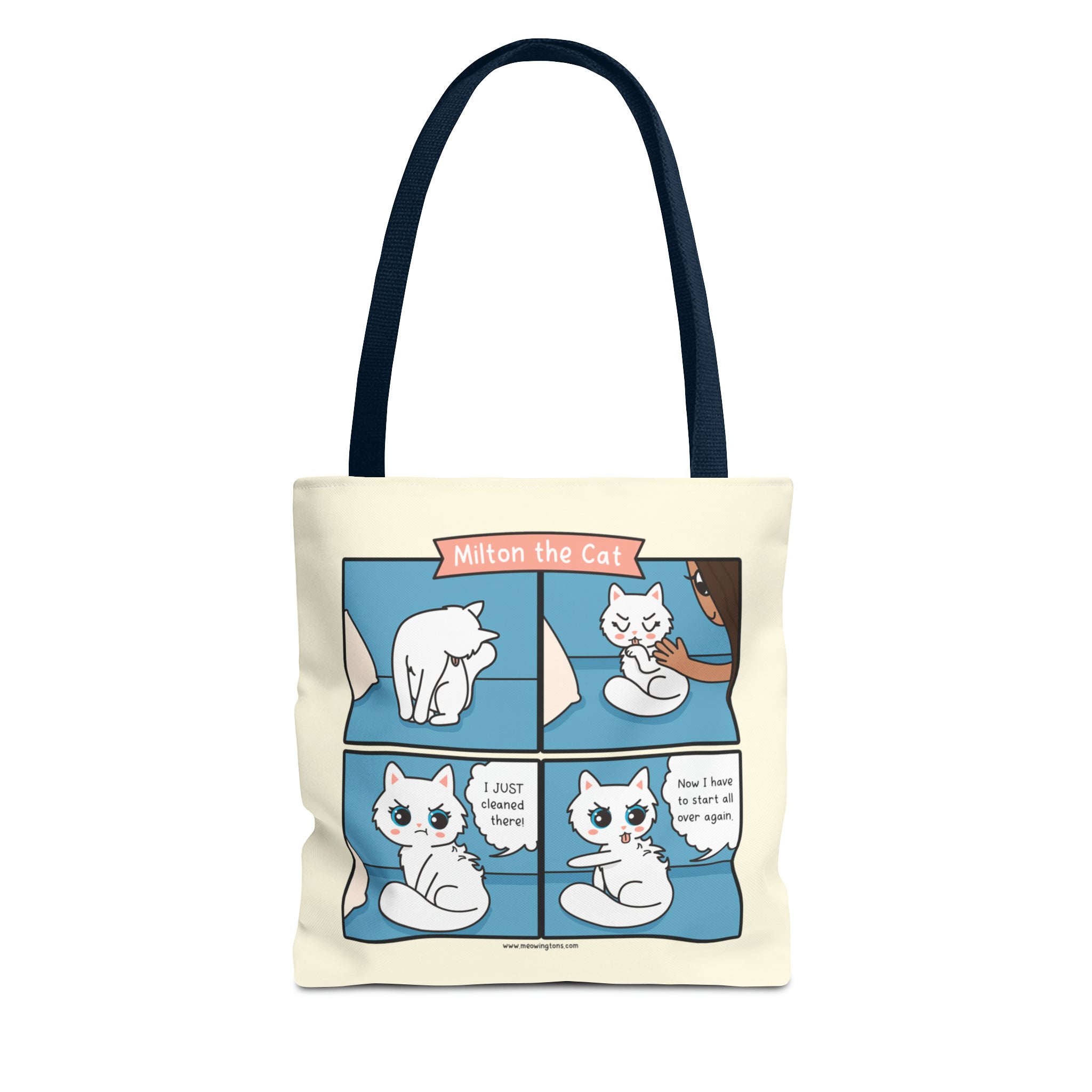 Introducing our Cat Grooming Comic Tote Bag – a must-have addition to our Milton the Cat Comic Collection, starring everyone's favorite sassy tabby and his charming sidekick, Millie. These playful felines steal the spotlight in our webcomic, Milton the Cat. Millie purr-fectly illustrates what it's like to be a cat with an annoying Human (aka Can Opener aka Treat Dispenser).