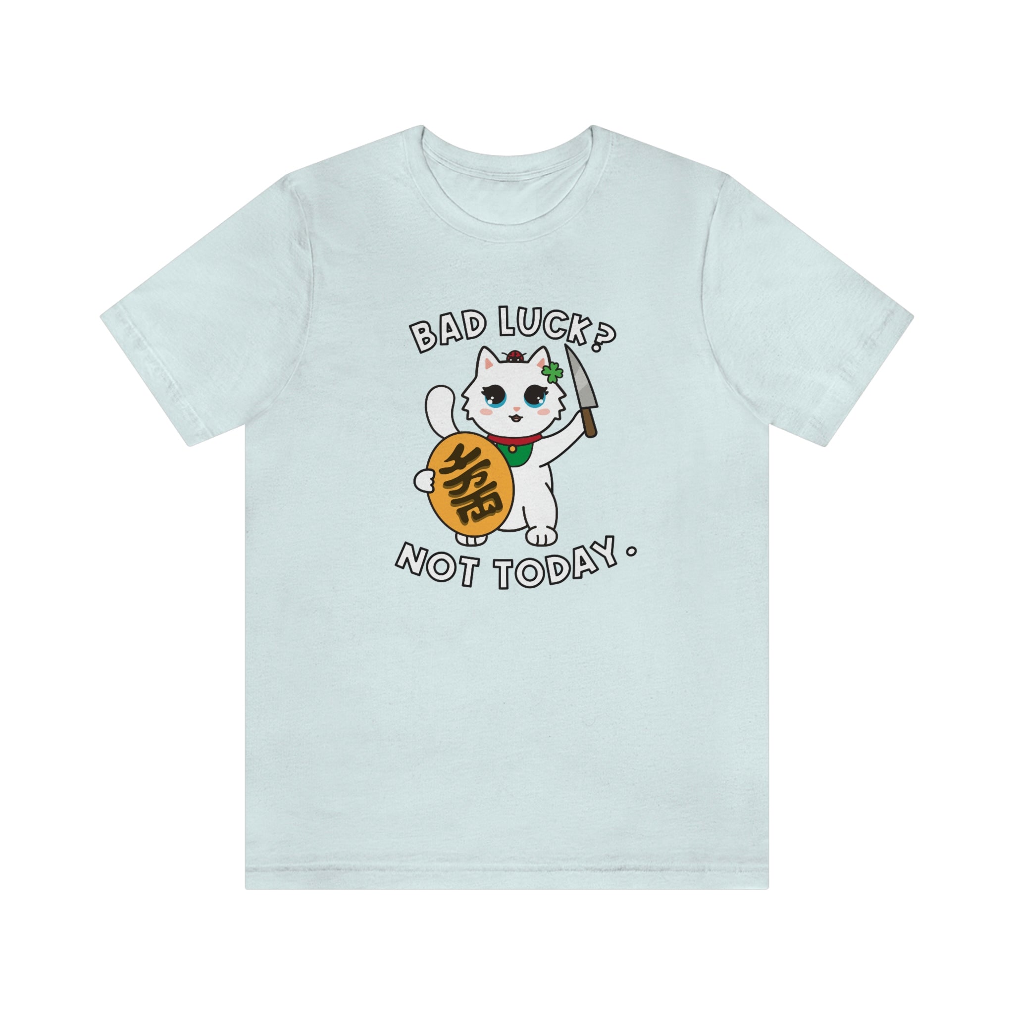 Introducing our newest addition to our collection of unisex t-shirts, featuring the co-star of our Milton the Cat webcomic, Millie, dressed as a Maneki Neko cat. Maneki Neko, also known as the "Lucky Cat," is thought to bring good luck and fortune to its owner. Our Maneki Millie is going the extra mile by sporting other symbols of good luck, from ladybugs to four-leaf clovers. And if that doesn’t do the trick of warding off bad luck? Millie has her signature knife in paw ready to tell bad luck, “Not today.”