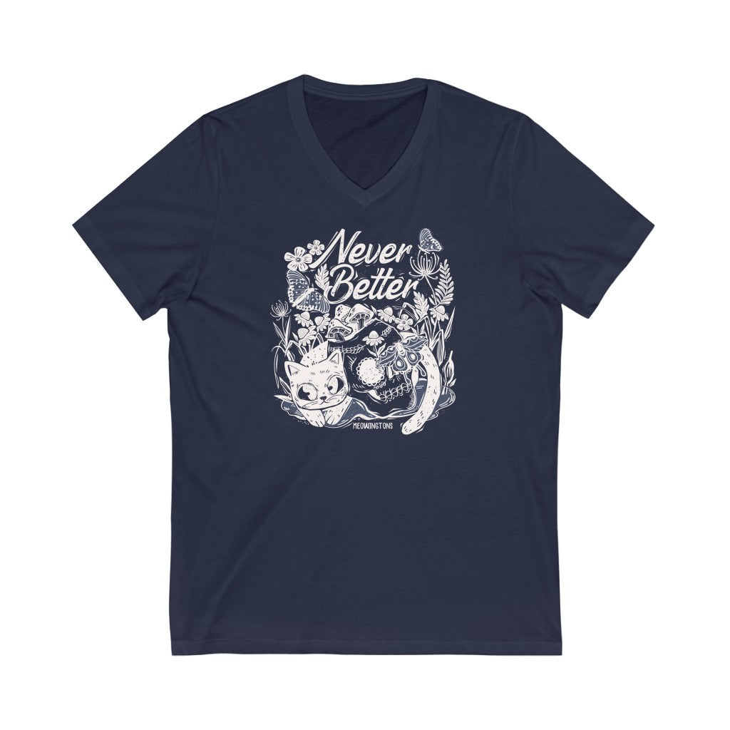 What options are available for the Never Better V-Neck Cat T-Shirt?