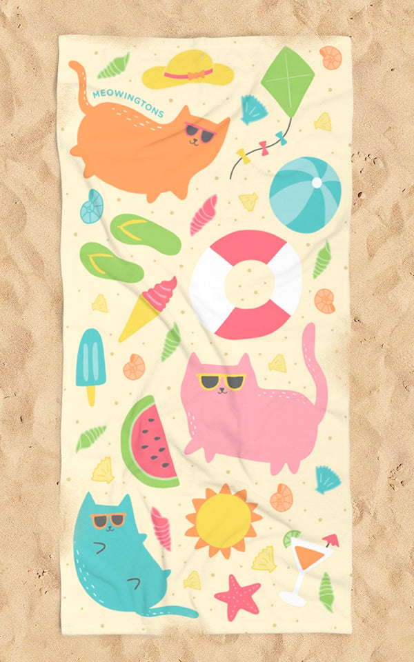 All you beach babes, beach bums, and beachcombers out there, say HELLO to summer with a brand mew beach towel! Headed to the beach? Spread out your Sunbathing Cats Beach Towel on those sandy shores and keep the sand and surf at bay. Whether you're searching for shells, soaking up the sun or taking a dip in the Big Blue, this lightweight kitty-cat beach towel will keep you high and dry, and you won't break a sweat lugging it around. Made from a 50% cotton, 50% polyester fabric blend to withstand all that sun and sand, this unique beach towel features a bevy of sunbathing summer cats.